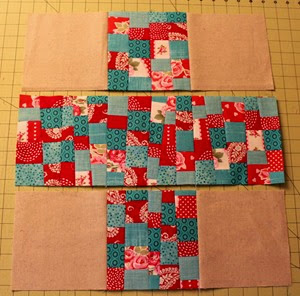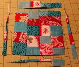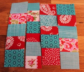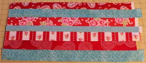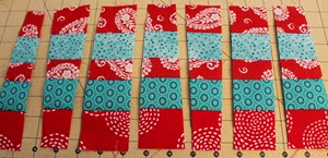 Arrange 7 strips from the fat quarters. You can alternate the red and blue or you can choose not to. I alternated most of my strips, but not all. Sew the strips together and press seams open.