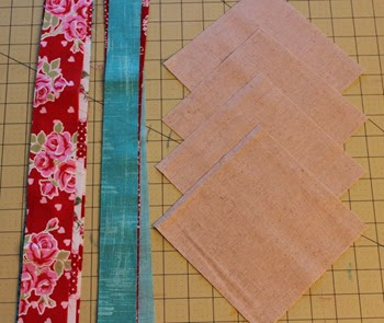 From the long side (22”) of the fat quarters, cut at least 21 strips of varying widths (I used 2” and 1.5”). From the linen, cut four 6.5” squares and two 12.5”x18” rectangles.